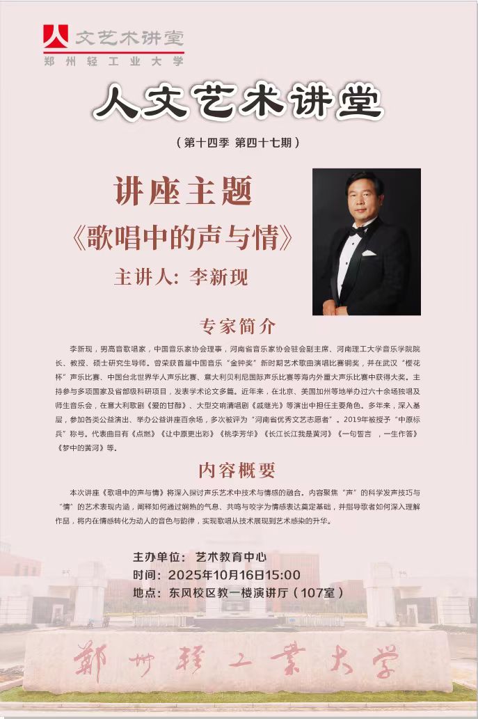 应我校艺术教育中心邀请,中国音乐家协会理事,河南省音乐家协会驻会副主席,河南理工大学音乐学院院长,男高音歌唱家,李新现教授将于20251016日(周四)下午1500,在东风校区教一楼(107)演讲厅开展题为《歌唱中的声与情》的讲座。