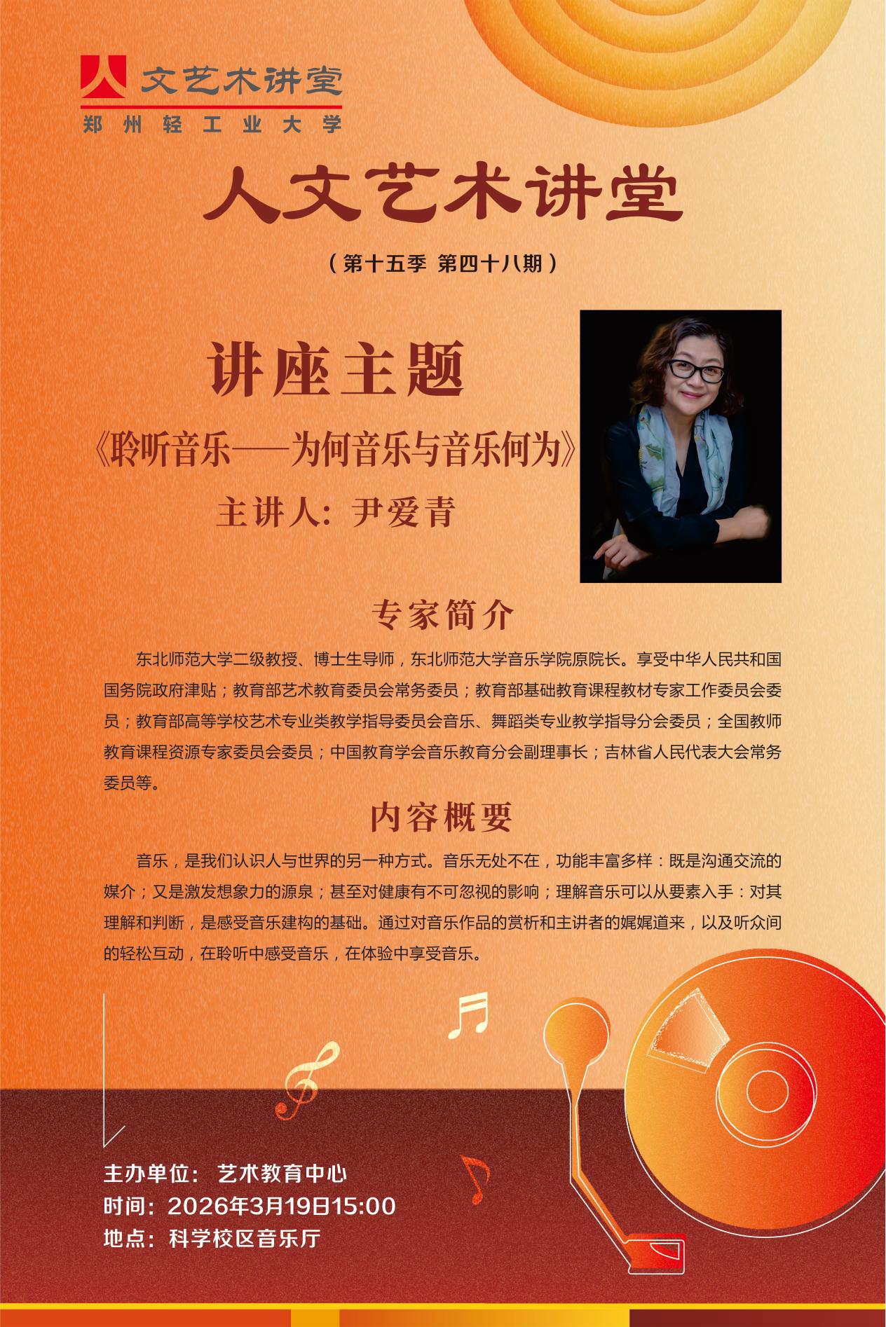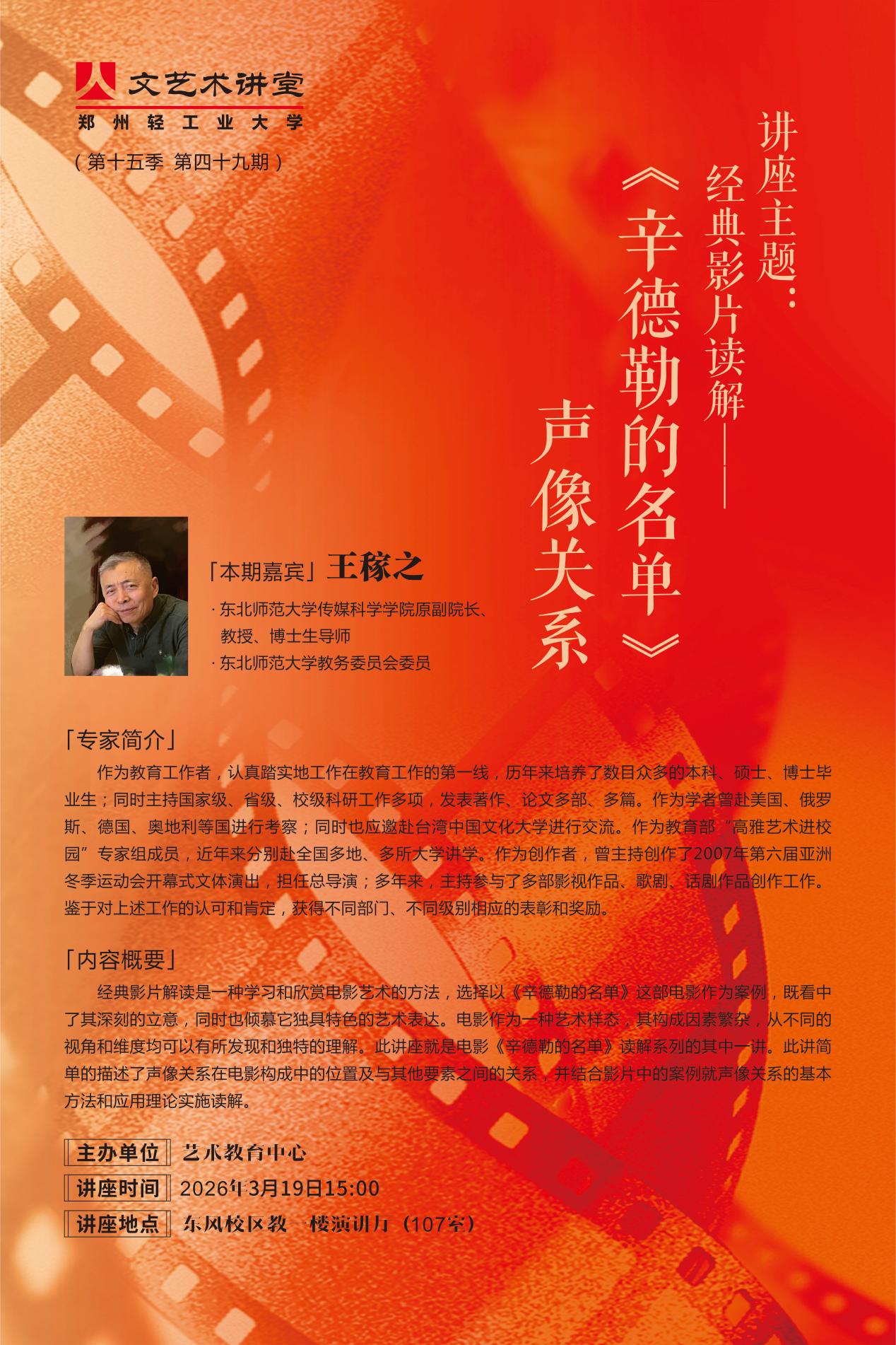 应我校艺术教育中心邀请,教育部艺术教育委员会常务委员,全国高校美育教学指导委员会副主任委员、东北师范大学音乐学院原院长,博士生导师,尹爱青教授,于2026年3月19日(周四)下午15:00,在科学校区音乐厅,开展题为《聆听音乐——何为音乐与音乐何为》的讲座; 东北师范大学传媒科学学院原院长,博士生导师,王稼之教授,于2026年3月19日(周四)下午15:00,在东风校区教一楼演讲厅(107室),开展题为经典影片读解——《辛德勒的名单》声像关系的讲座。 诚邀广大师生届时莅临参与观看!